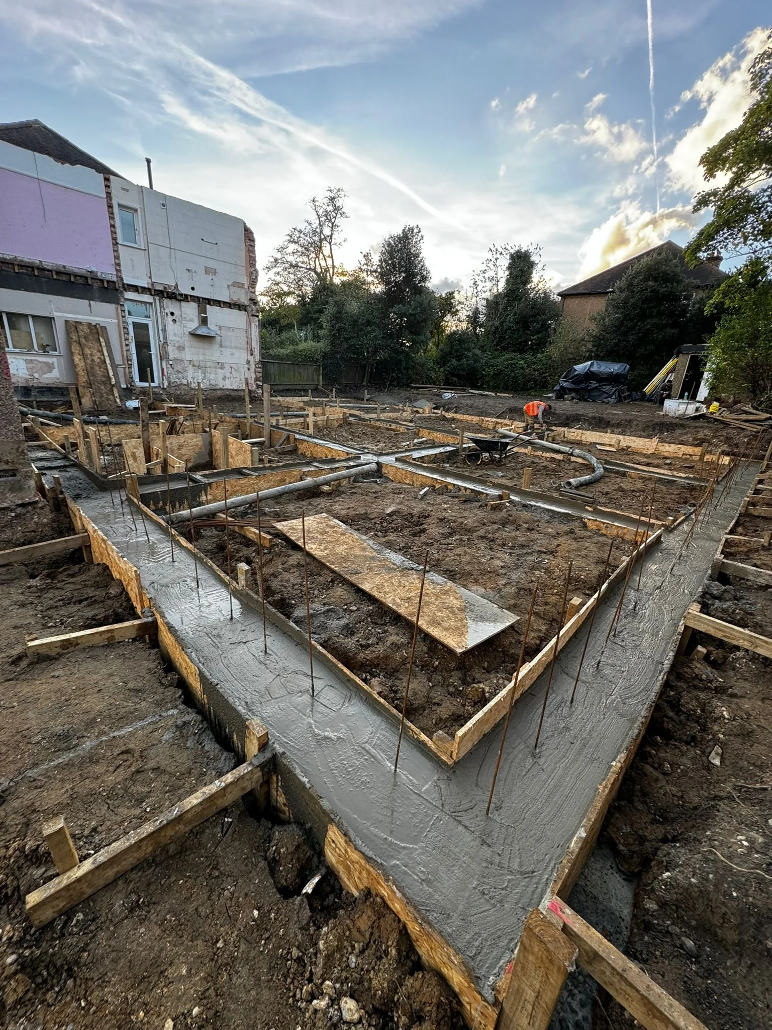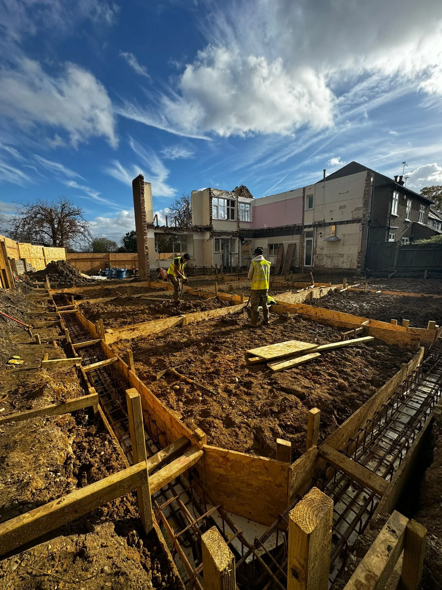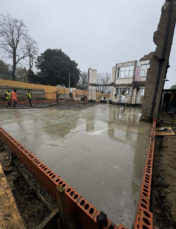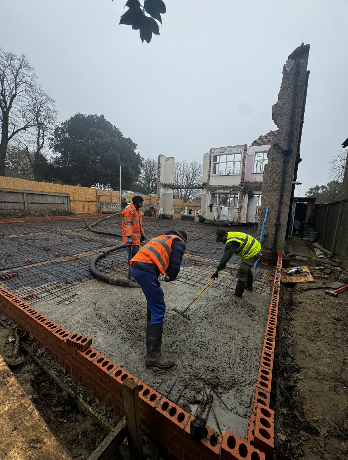 With the ground broken and excavation complete, the next step at Woodford Green was to define exactly where the building would sit. Formwork was installed, Steel reinforcement bars were then carefully positioned within. With thorough inspection passed, the pour could finally begin.