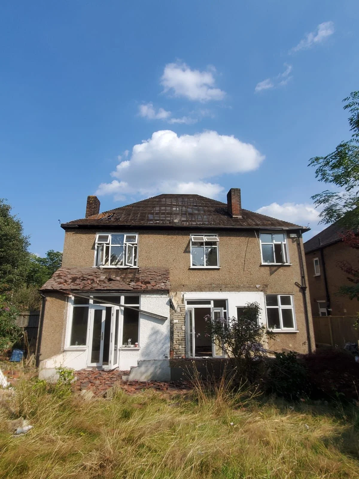 The property prior to demolition: a two-storey detached house with original render facade, dual chimneys, and a rear extension.